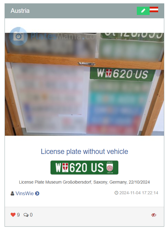 In Vienna dealer and export plates have the format W12ABC, Temporary plates have W1ABC,W12AB or W123A. Motorcycle and moped plates have W1ABC or W12ABC.