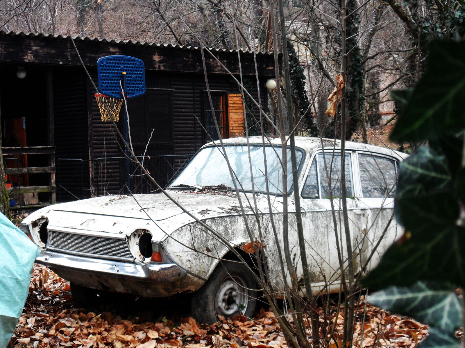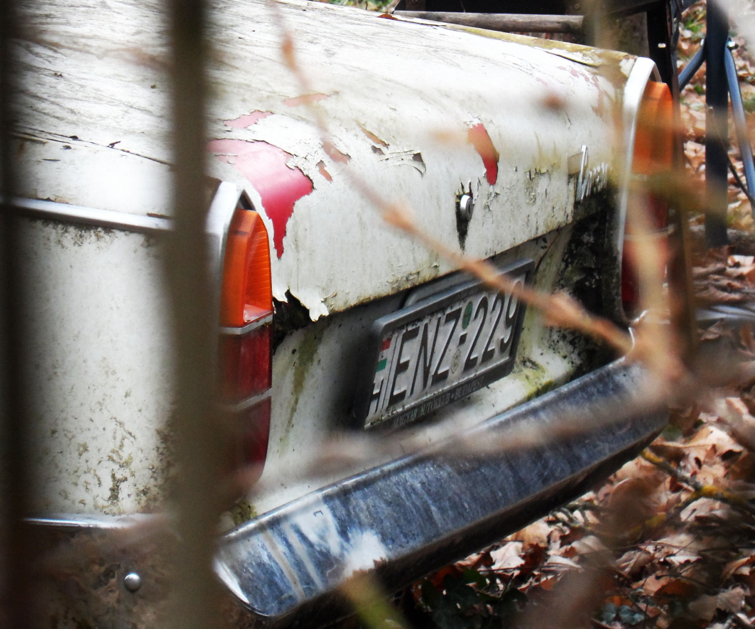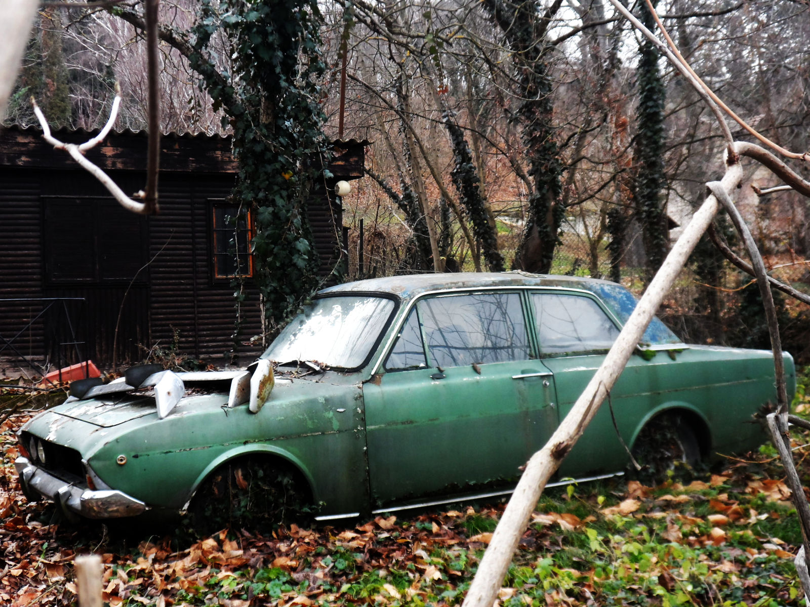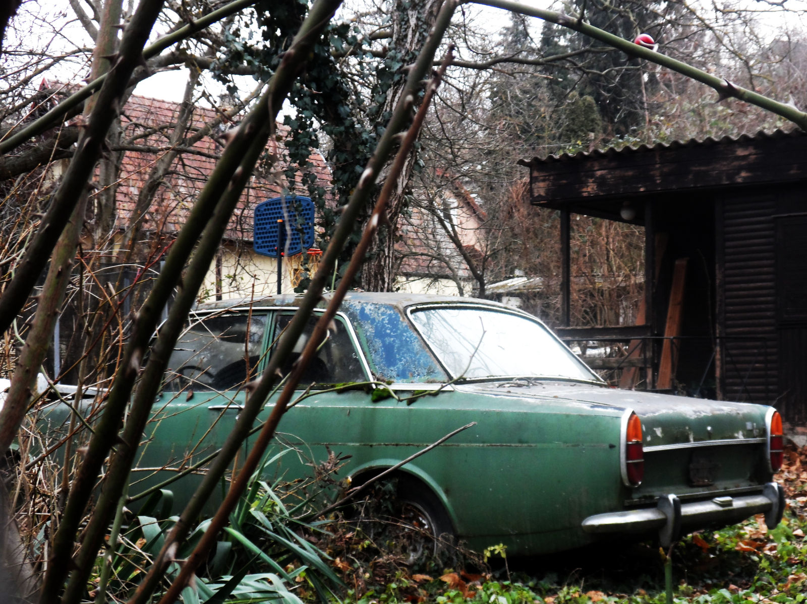 There are 4 ancient abandoned cars parked in a row in this yard, I discovered them on Google Street View. (a friend lived close by, but I haven't been to this particular spot) I went to take a look in April this year, and noticed a rear plate on one of them! Unfortunately the leaves were already too thick for a good shot of the whole car, so I decided to return in the winter, which happened the last weekend.
