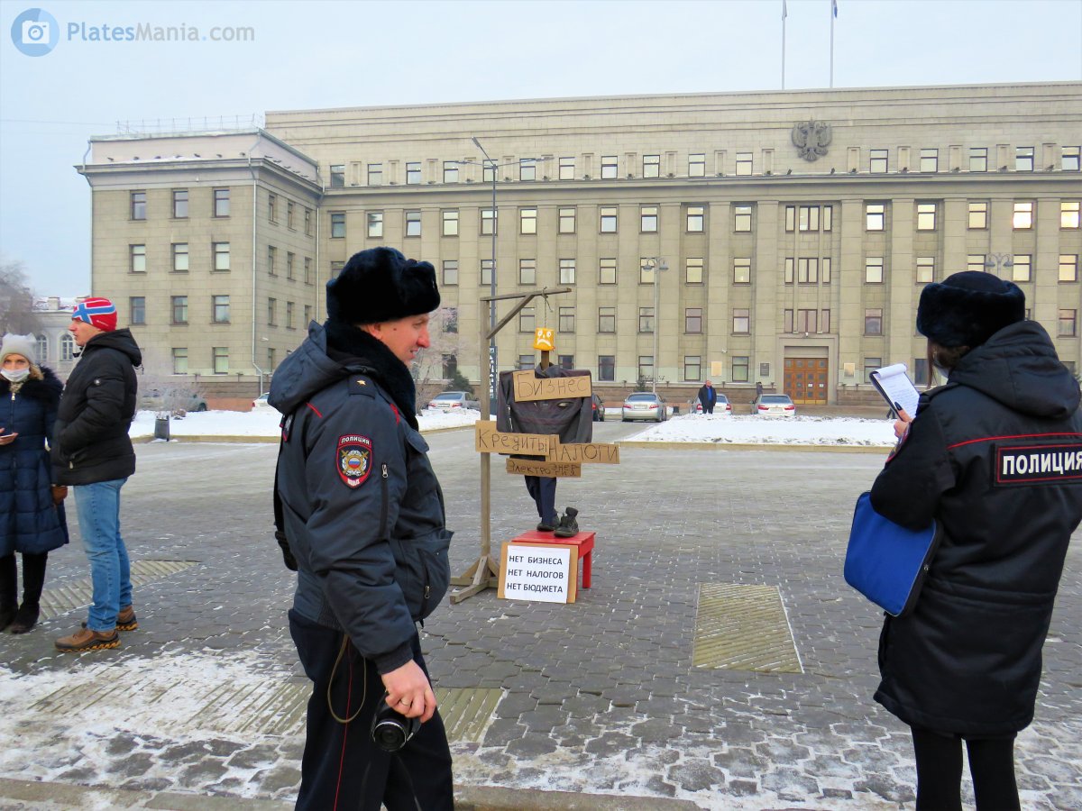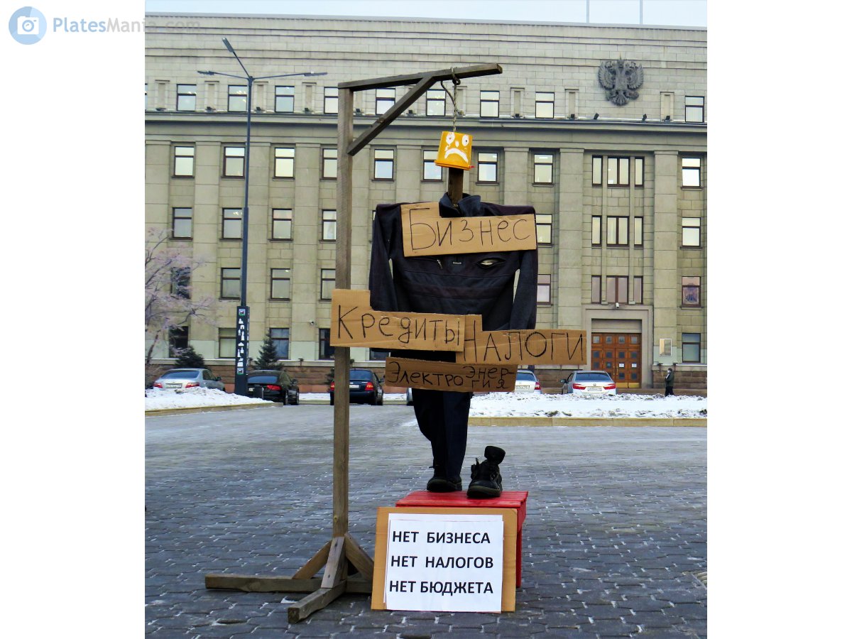В центре проводилась акция бизнесменов с одиночными пикетами и чучелом повешенного предпринимателя. Начиналось при мне, очень быстро подъехали оперативные службы. Ну и эвакуатор в этой же песочнице.