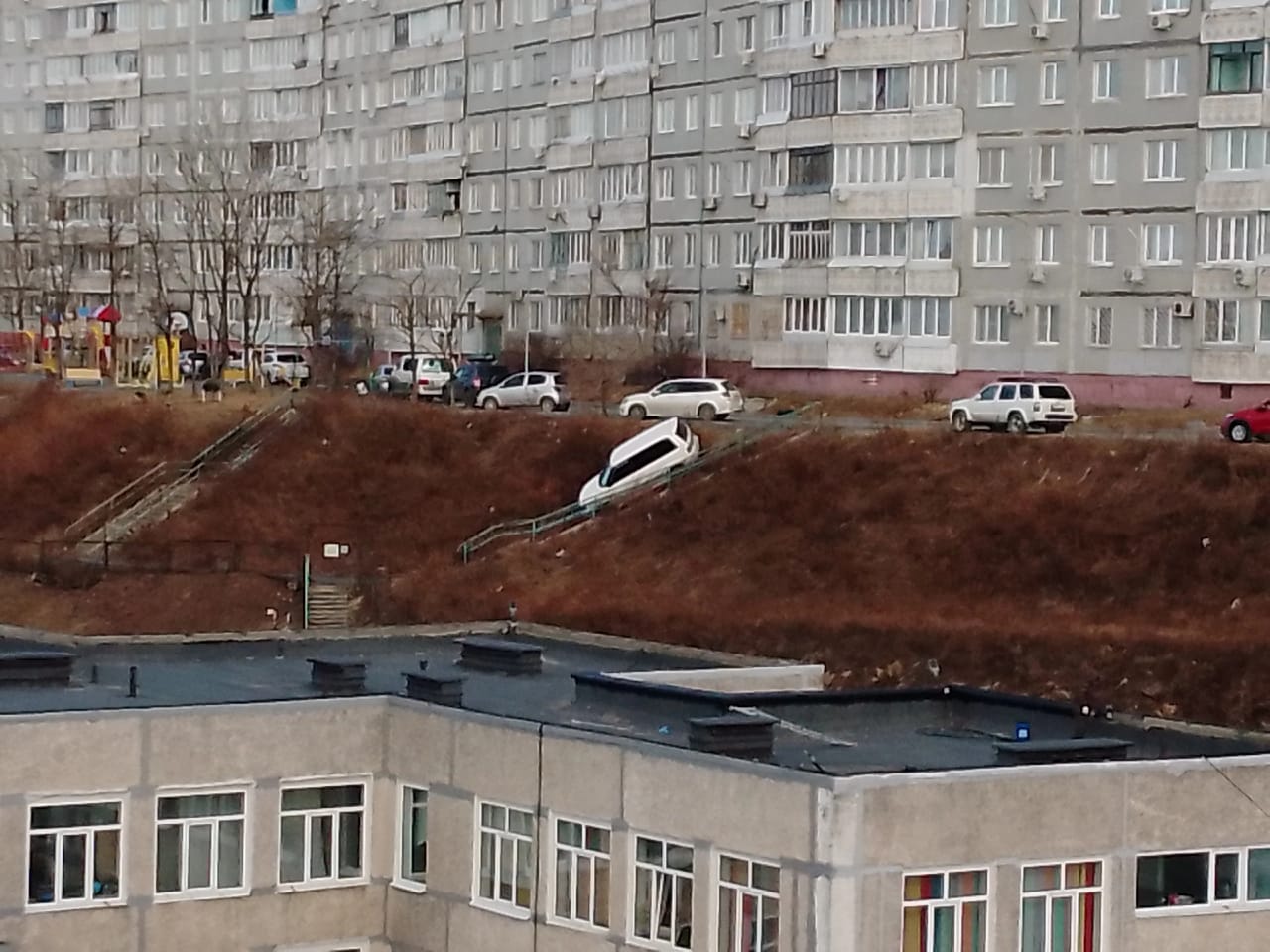 это хорошо у нас город на сопках, была б равнина - этот косогор бы весь плотничком заставлен был.. уверен на все 199% просто надо было не "ёлочкой" а боком ставить, глядишь бы не укатилась так.. ну зато за ним можно припарковаться)) парковочное место освободилось