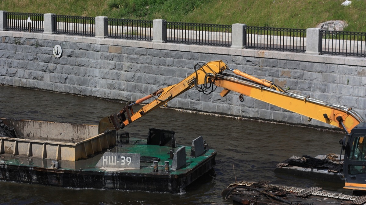 На Фонтанке этим занимался земснаряд (http://fleetphoto.ru/ship/6765/). Здесь для него, видемо, нехватает места.